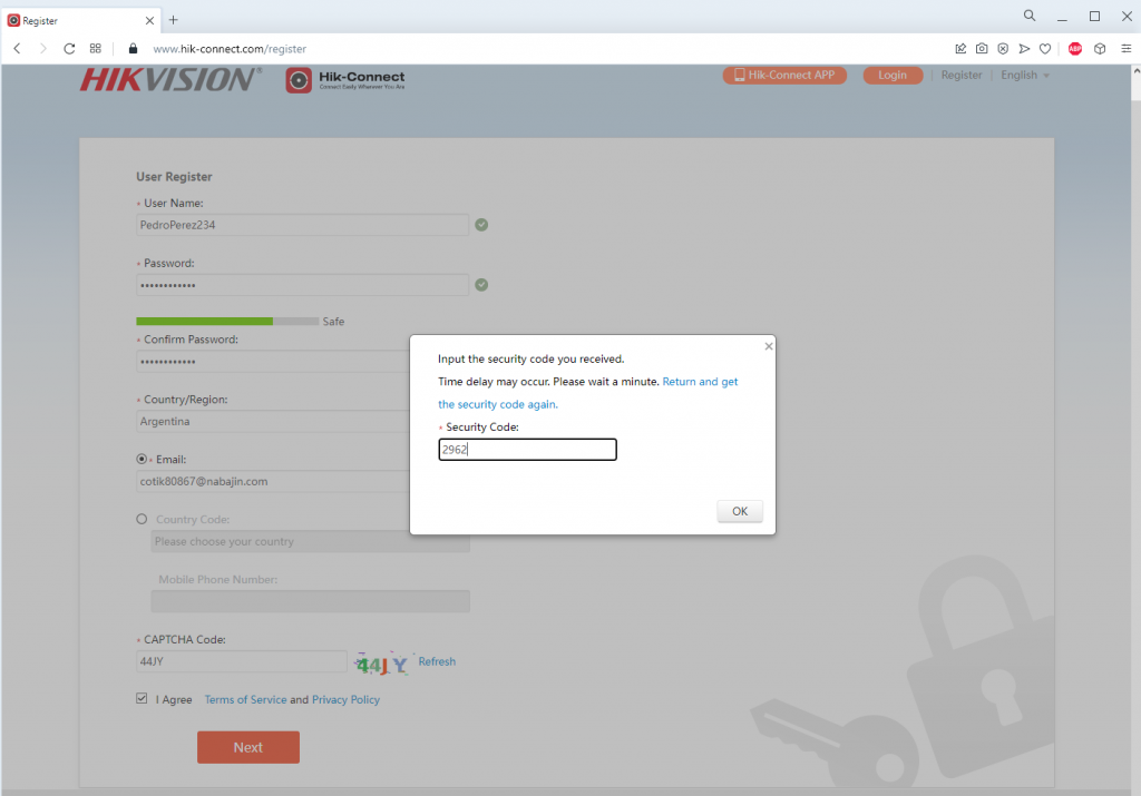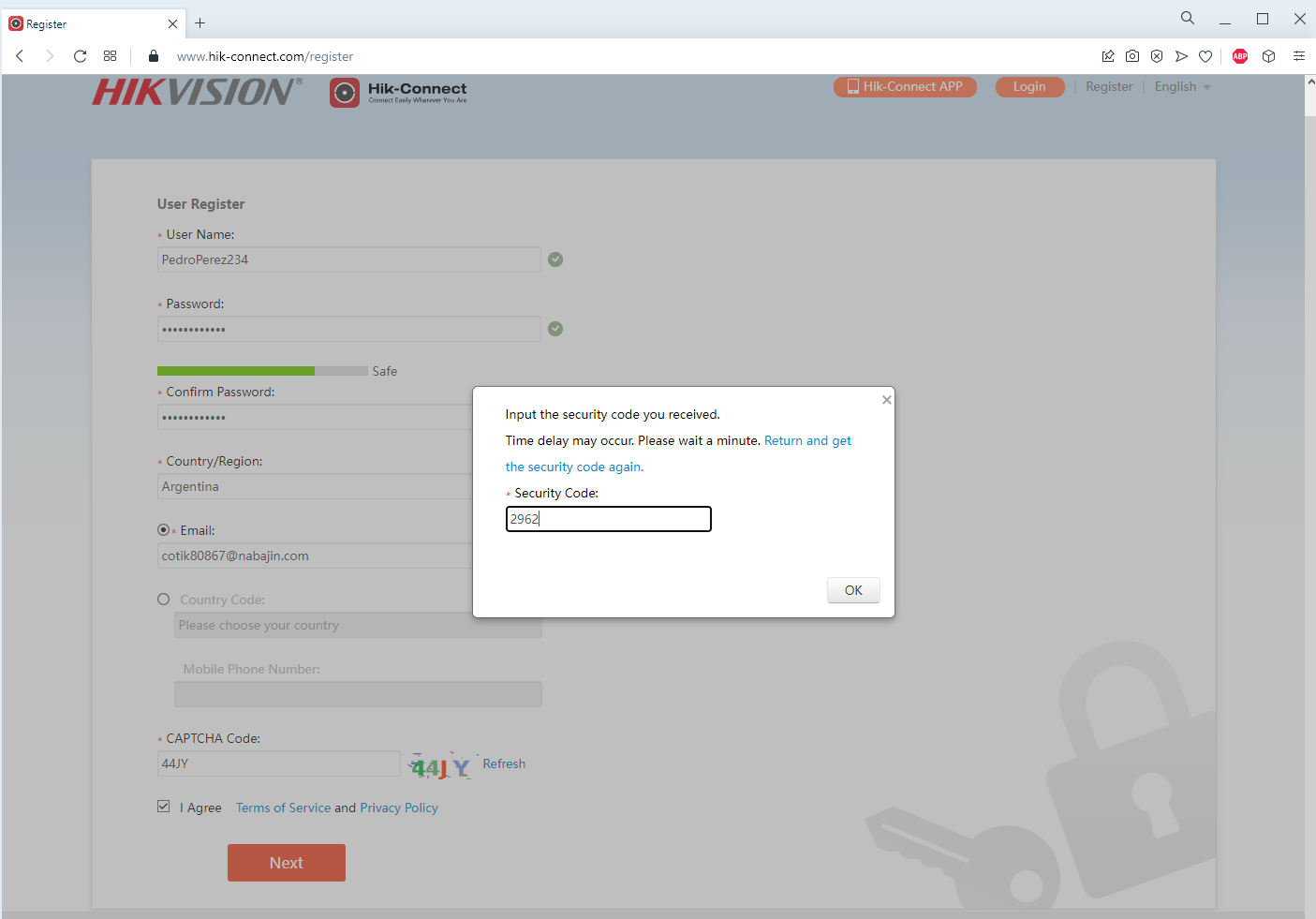 Aparecerá una ventana solicitando el número de confirmación. Ya que en el ejemplo se usó un correo como método de verificación, revisamos la bandeja de entrada en nuestro correo y copiamos el número que nos haya enviado el servicio de Hik-Connect, para pegarlo o escribirlo en la ventana. Luego se hace click en el botón Ok.